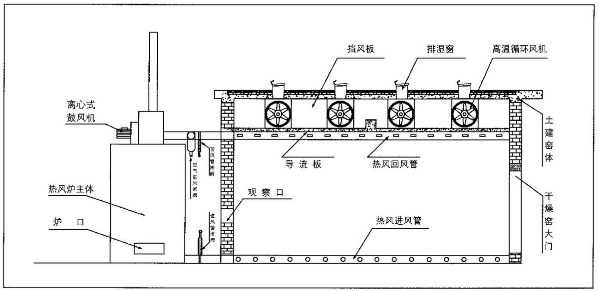 熱風式干燥設備工作原理是利用燃燒產(chǎn)生的熱能,加熱窯內(nèi)的空氣,由熱風爐頂部主風機將窯內(nèi)的空氣通過管道吸入爐體,將空氣加熱。再通過管道,送入窯內(nèi),由窯內(nèi)的循環(huán)風機不斷的循環(huán)對窯內(nèi)的木材均勻加熱。木材干燥過程中如需要蒸汽,可由熱風爐內(nèi)的蒸汽發(fā)生器提供,如果是一爐兩房或多房時,管道上裝有插閥,通過插閥的調(diào)節(jié)來控制窯內(nèi)的溫度。在干燥的過程中,由于木材要進行排濕,在窯頂上留有排濕孔(根據(jù)地區(qū)而定)和裝有抽濕機,用來調(diào)節(jié)排濕的快慢.